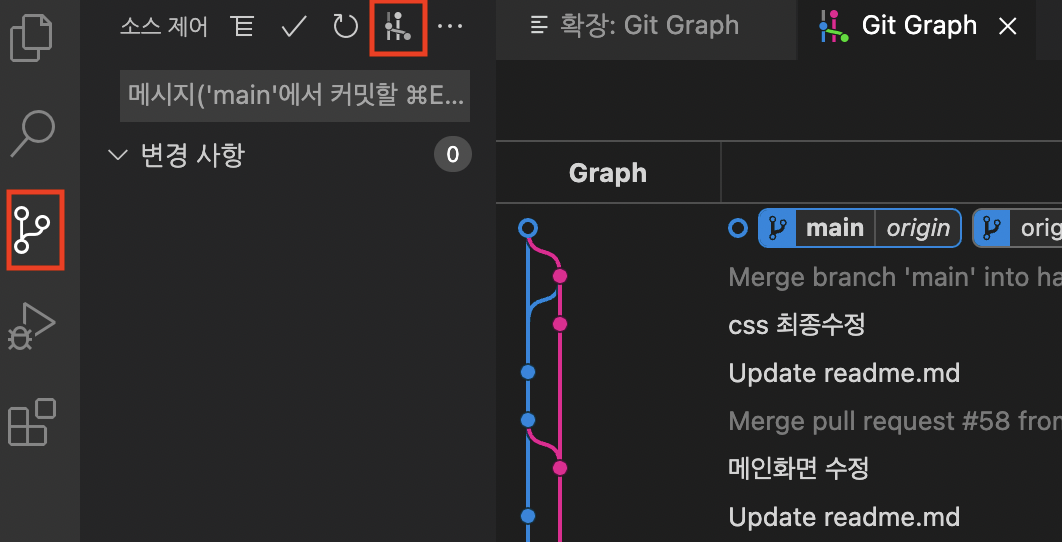 여태 commit을 할때 남겨놨던 메모나 어디서 merge했는지, branch의 개수같이 상태를 확인할 수 있다.