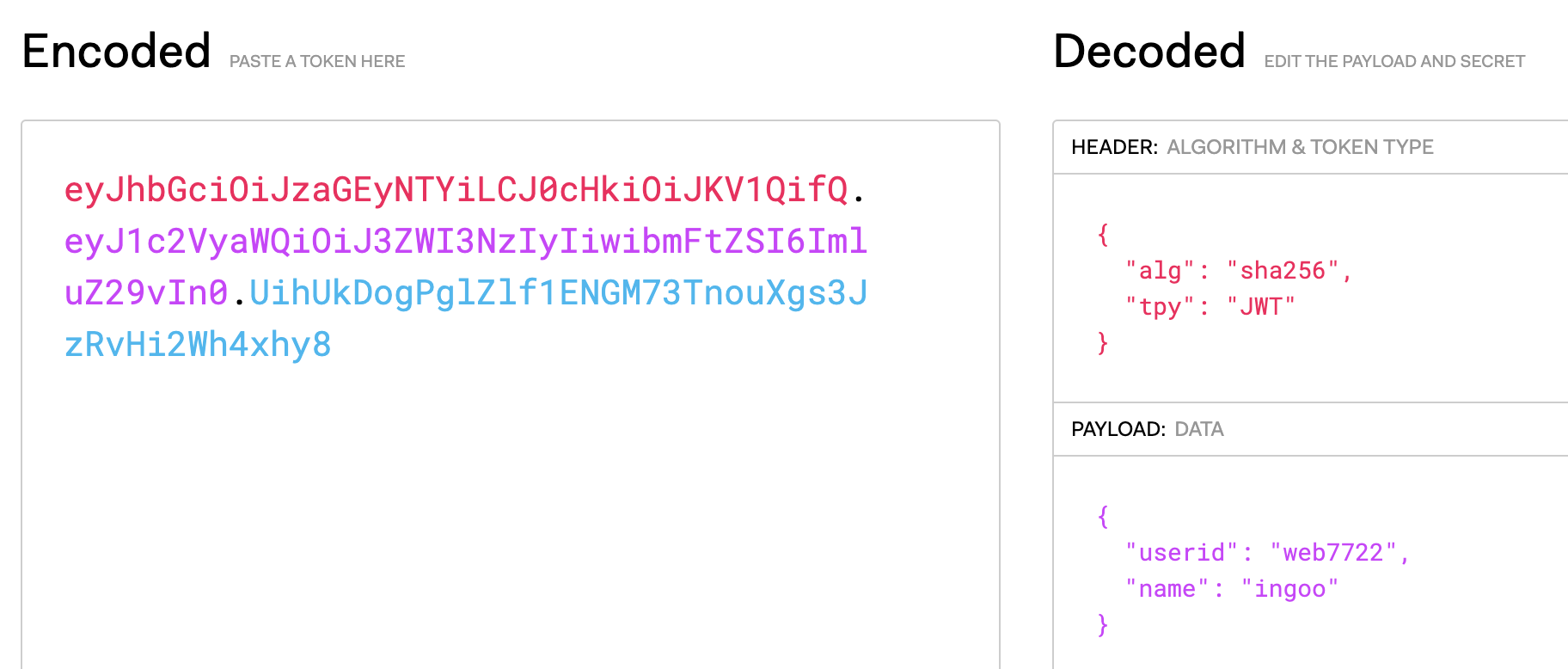 //결과 eyJ1c2VyaWQiOiJ3ZWI3NzIyIiwibmFtZSI6ImluZ29vIn0