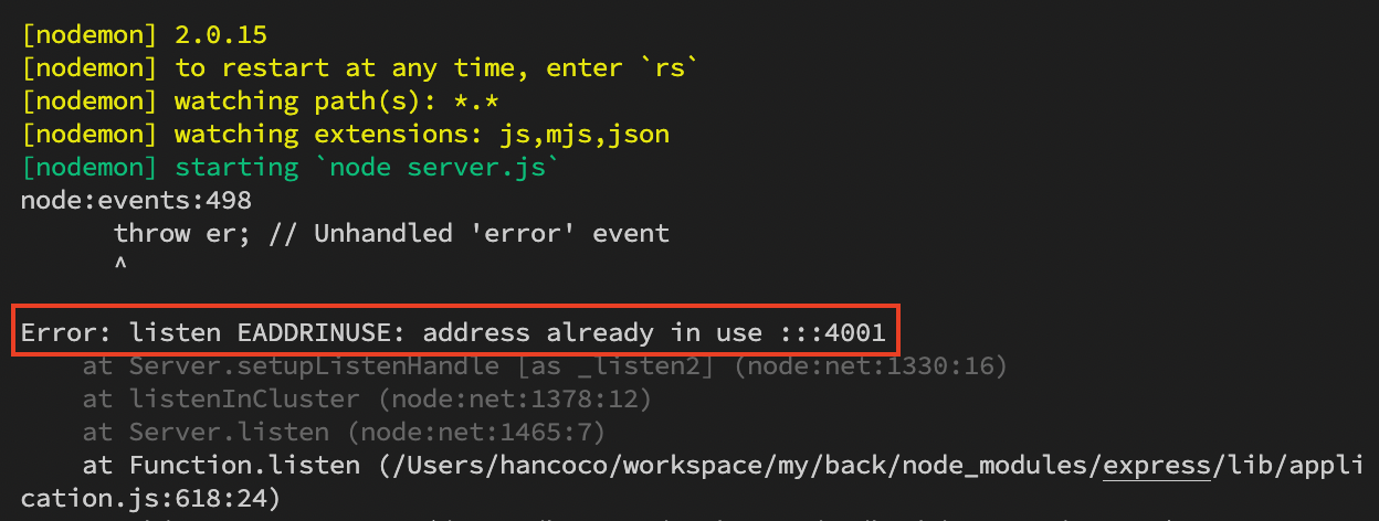 해당 :4001라는 포트로 이미 사용중이라고하는데, 프로그램은 이거 하나 돌리고 있는 중인데요.