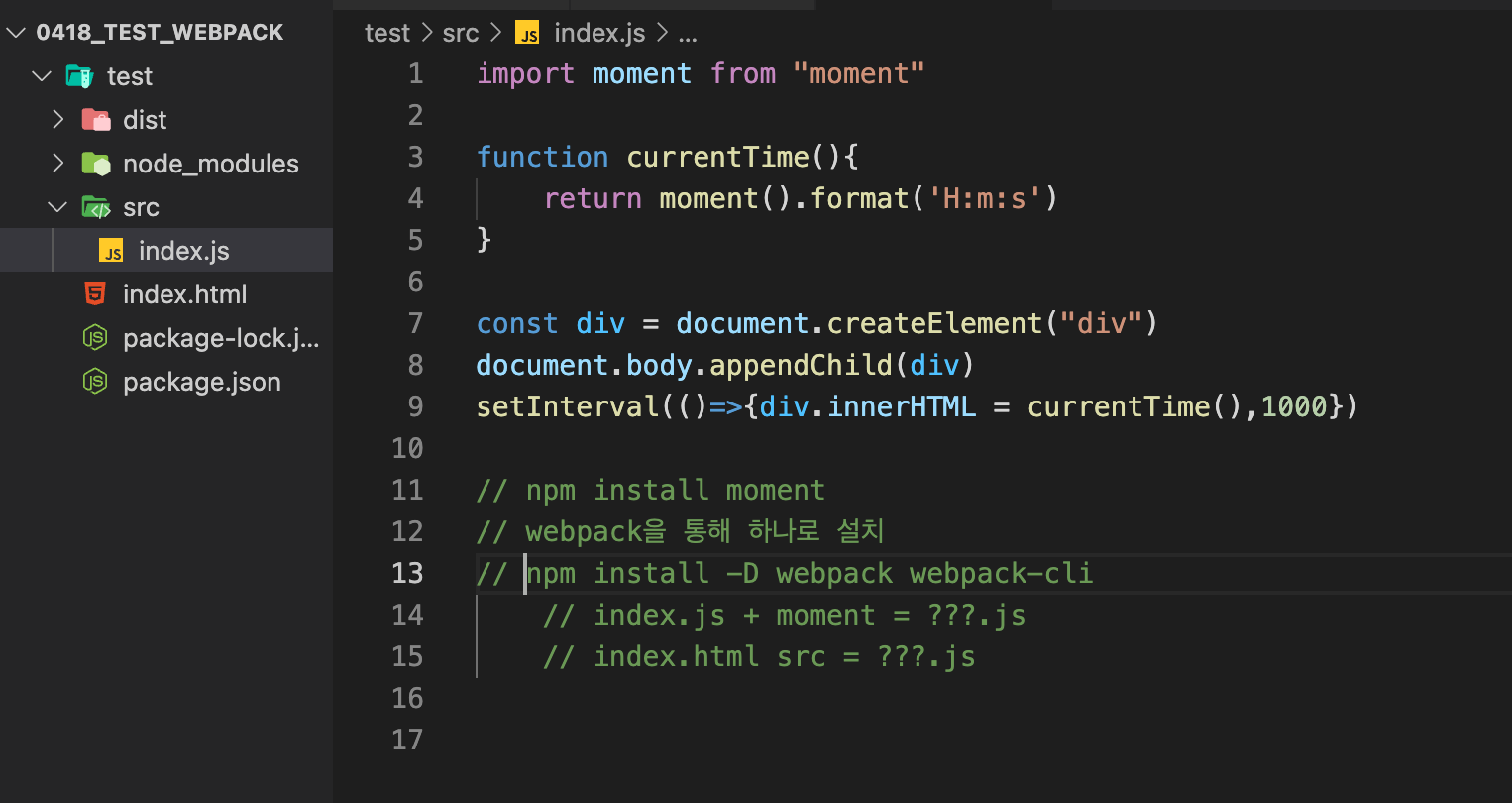 test폴더를 만들고 그 안에 index.html, dist폴더, src폴더를 만든 후 webpack 라이브러리를 설치한다.