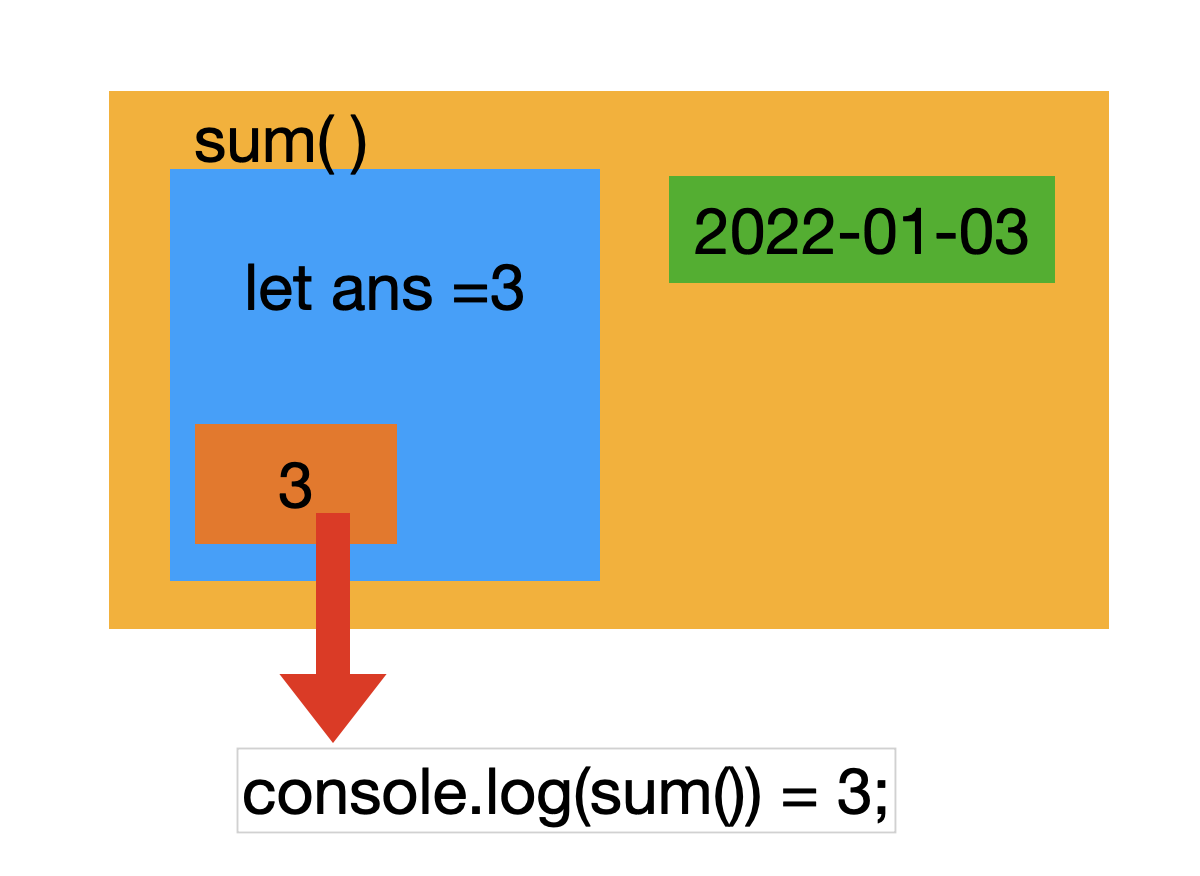 - 서로 다른 코드블럭에 저장했기때문에 ans에 저장된 값 3은 공유될 수 없다. 방법은 return을 통해서 값을 꺼내는 방법 밖에 없음.