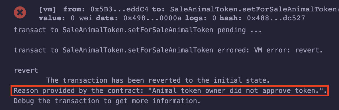 본래 목적이었던 setForSaleAnimalToken>transact를 클릭하면 문제없이 실행된다.