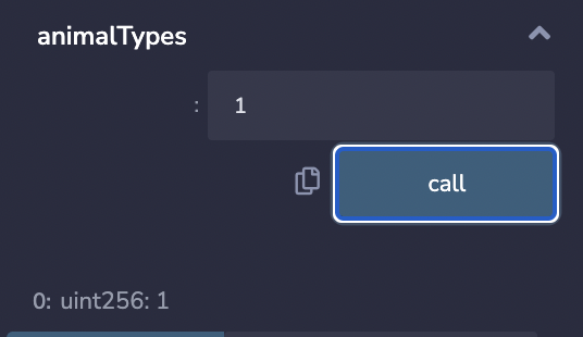 MintAnimalToken > 민팅 > animalTypes에 1 입력, call 클릭
