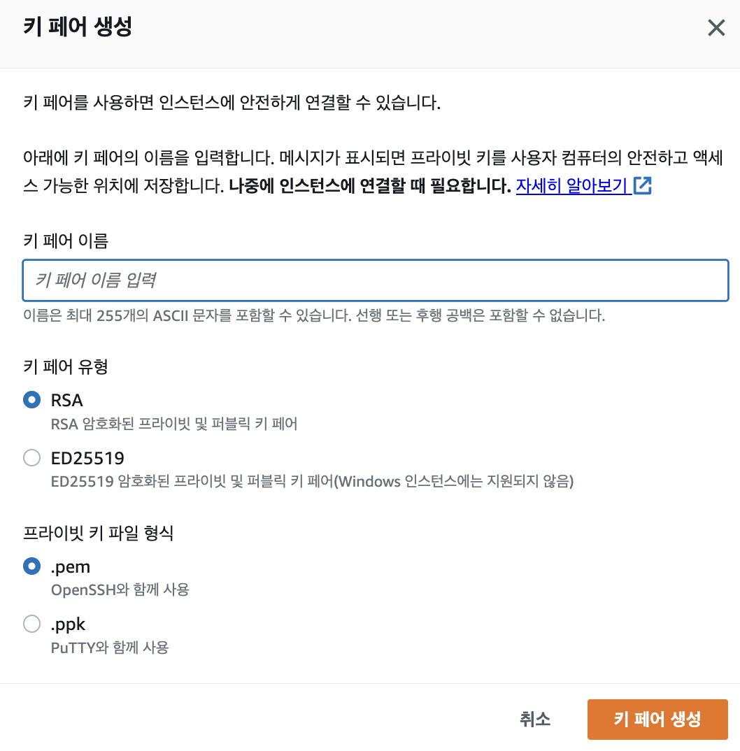 원하는 키 페어 이름을 작성하고 생성하기를 누르면 자동적으로 내 서버에 대한 키를 만들어준다