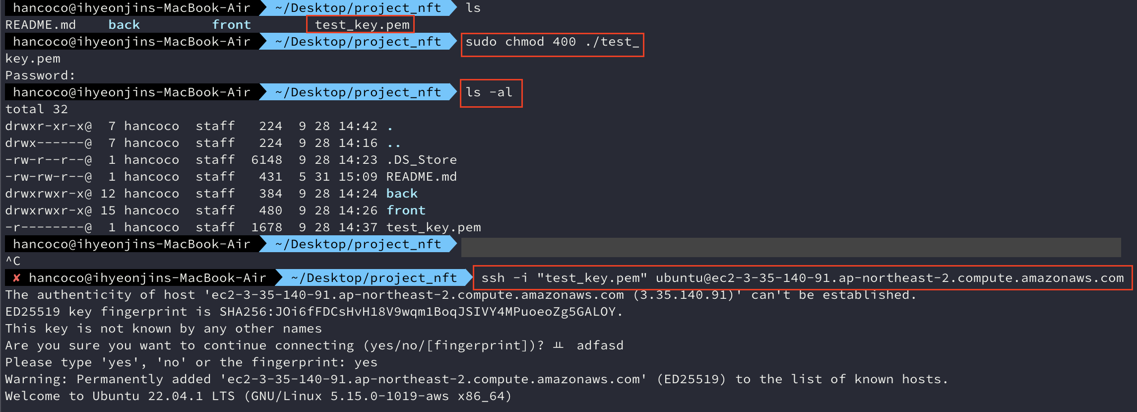 비밀키가 있는 폴더에 접근한 후에 다음과 같이 콘솔에 입력해서 aws에서 제공해주는 컴퓨터와 연결한다.