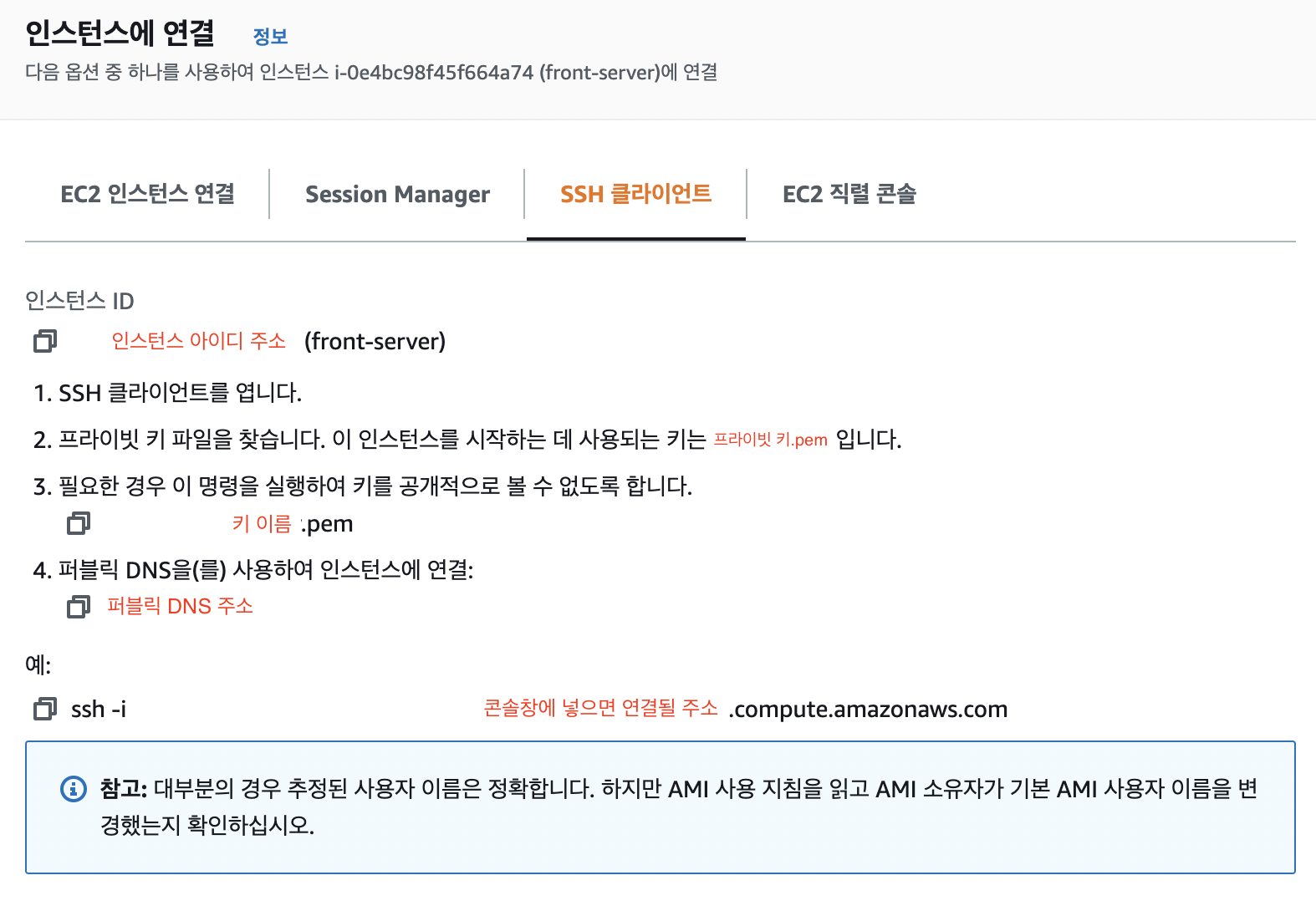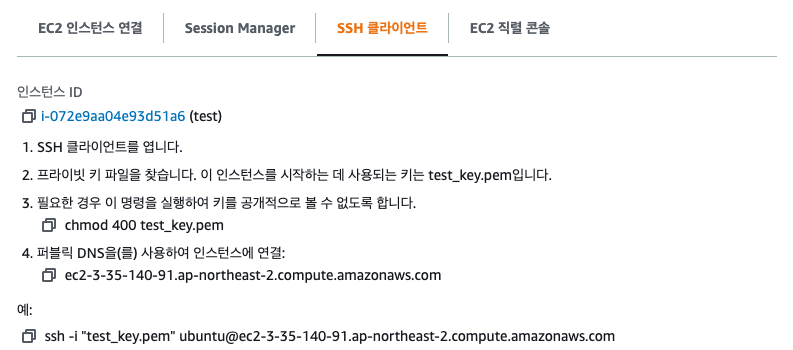 ssh -i "키이름.pem" ubuntu@퍼블릭IPv4