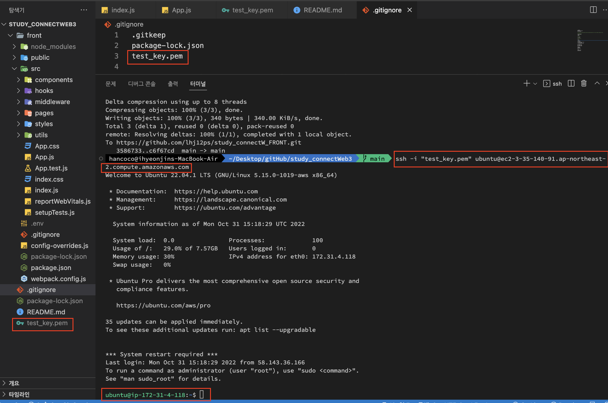 root 폴더에 넣어준 test_key.pem을 깃헙에 올리지 않도록 .gitignore에 넣었는지 꼭 확인하자.