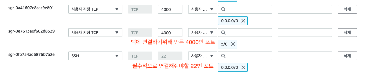 인스턴스 보안 그룹에 다시 들어간 후, 인바운드 규칙 편집에 들어가서 22번 포트와 필요한 4000번 포트를 연결해준다.