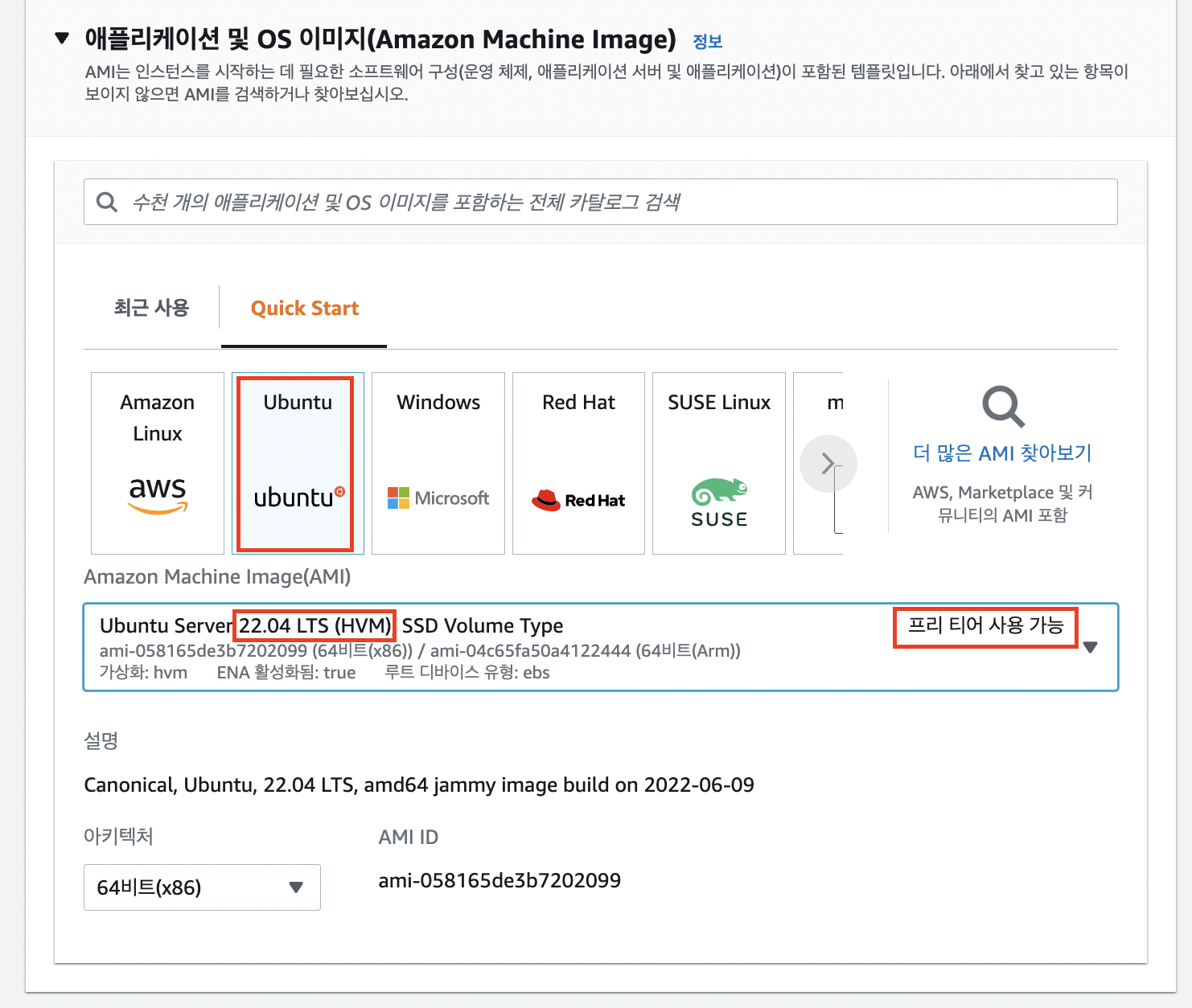 AMI는 22.04버젼을 골랐고, 프리 티어 사용 가능한걸 선택하면 된다.