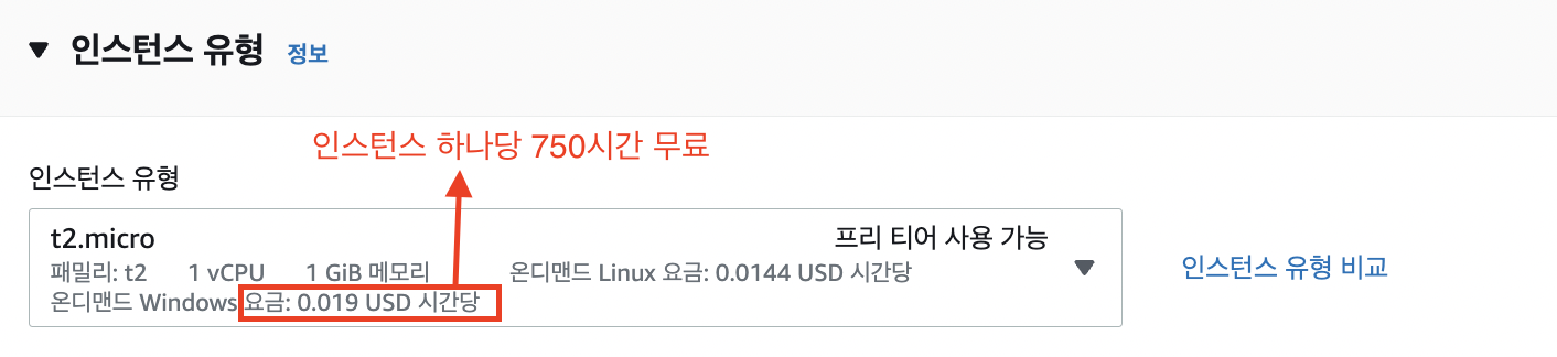 시간당 요금이 나가므로 잘 보고 선택하자. ( 내가 선택한 요금은 인스턴스 하나당 750시간 무료. )