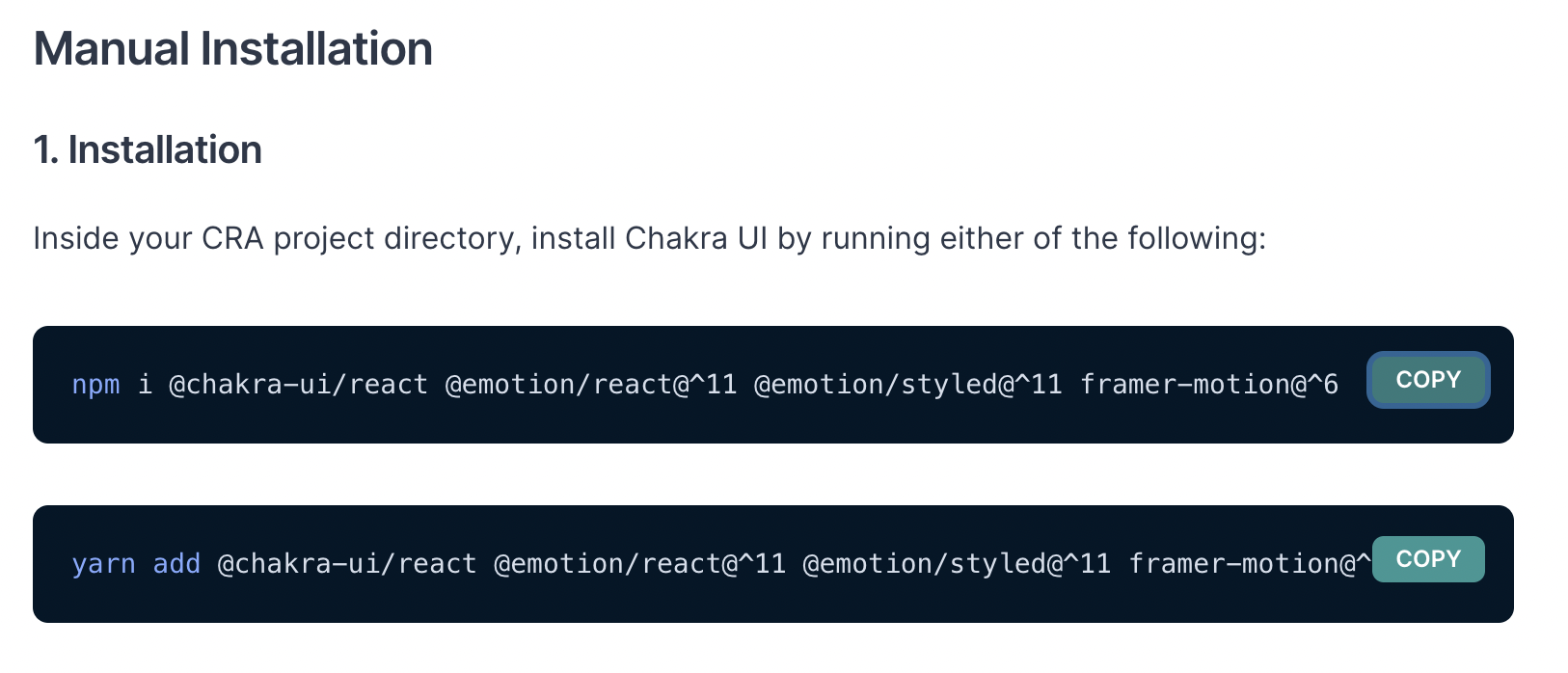 $ npm i @chakra-ui/react @emotion/react@^11 @emotion/styled@^11 framer-motion@^6