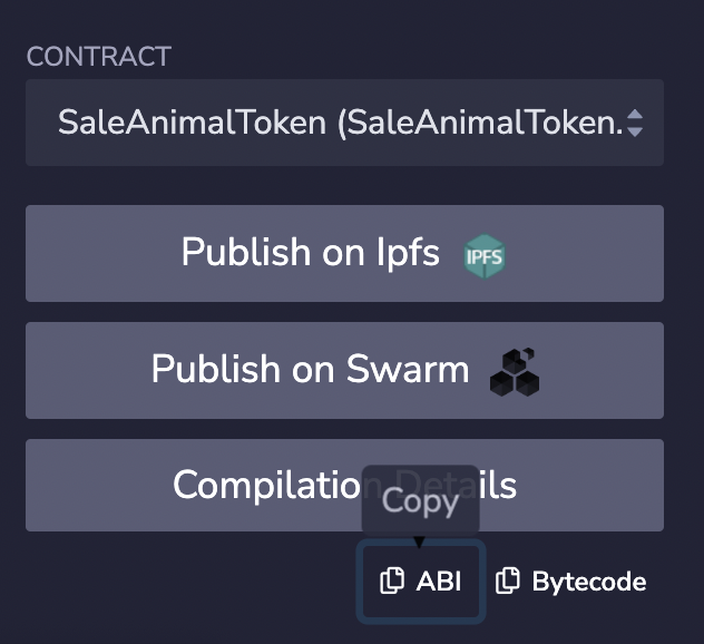 CONTRACT에서 saleAnimalToken, mintAnimalToken을 선택해서 각각 ABI를 복사해 아래 코드에 붙여넣는다.