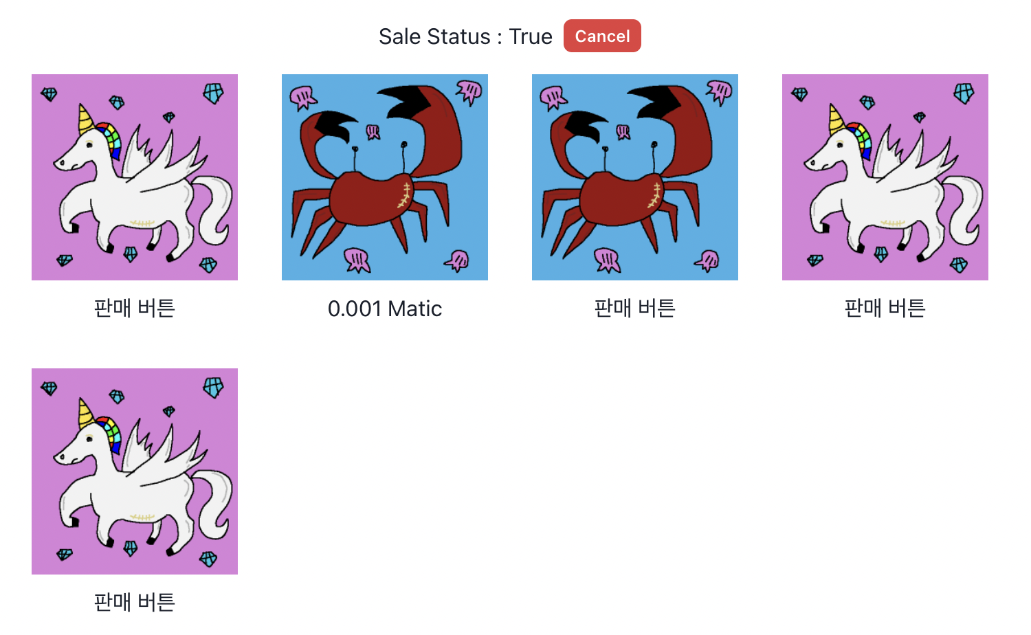 Sale Status : False [approved]를 클릭하면 판매승인 상태로 바뀌면서 Sale Status : True [Cancel]로 바뀐다.