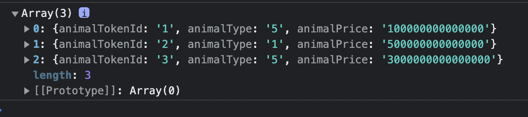 .onSaleAnimalTokenArray(i) // 인덱스 값을 넣었을때 몇번째인지(=tokenId) 값을 알려줌