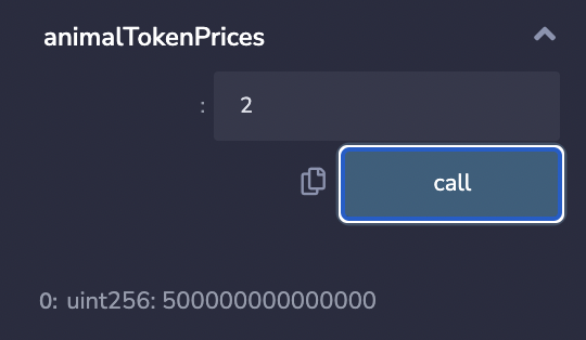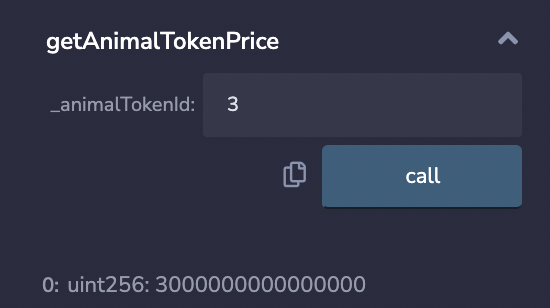 .animalTokenPrices(animalTokenId) // 뽑은 카드 번호를 입력하면 얼마인지 알려줌. (Wei 기준)