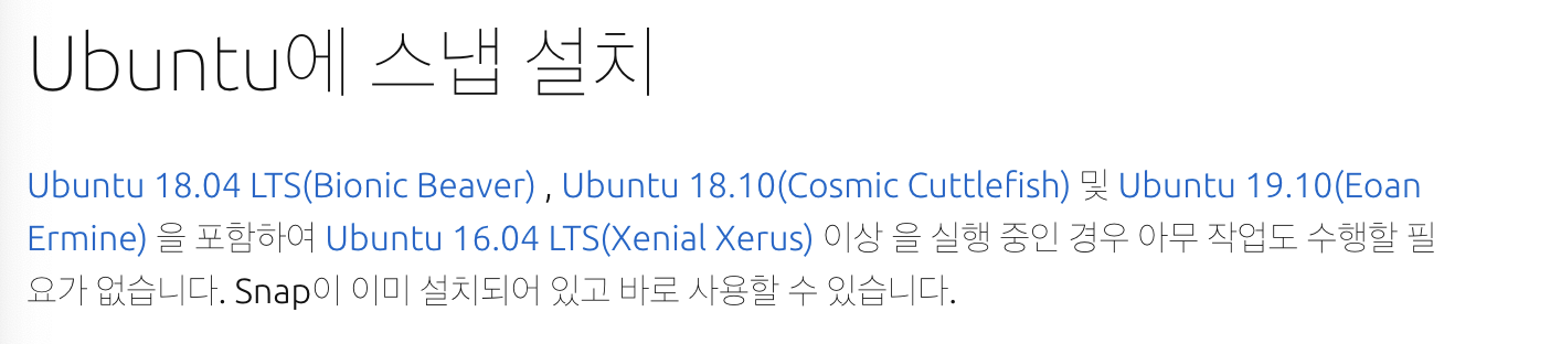 공식사이트가 예전에는 직접 설치하는 방법을 권했지만 최근엔 snap을 통해서 설치하는 것을 추천하고 있다.