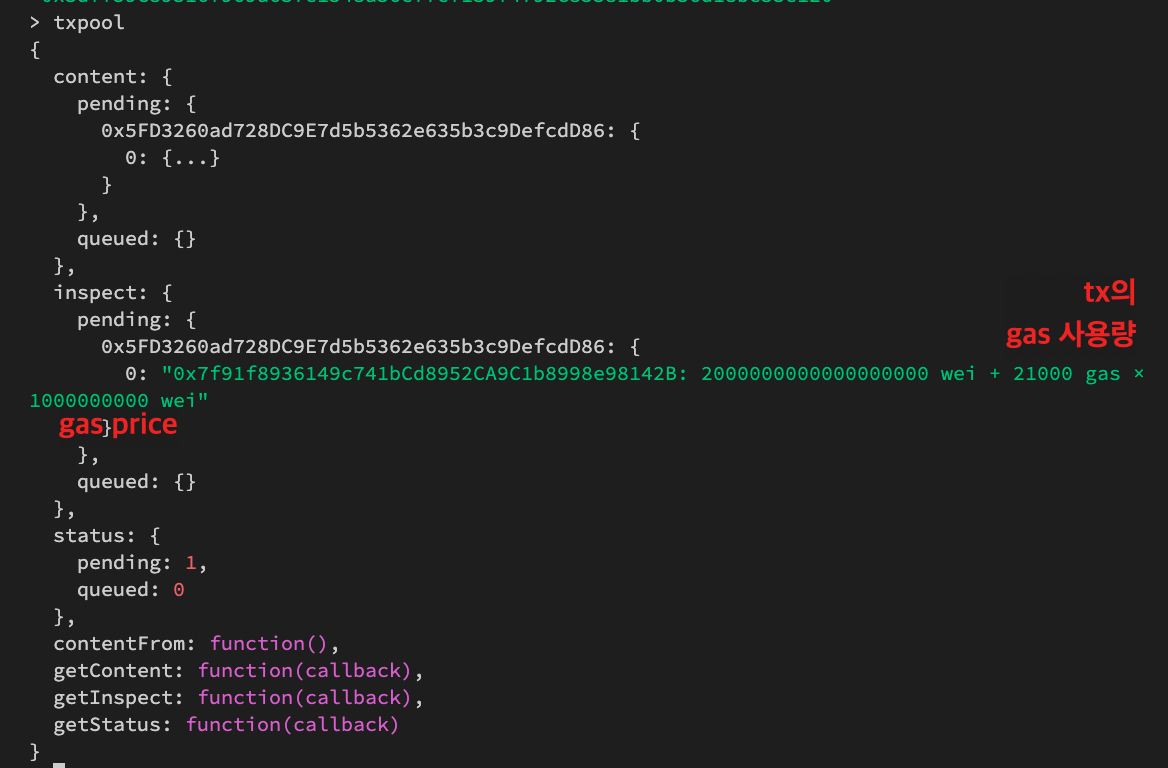 왜냐하면 트랜젝션풀(txpool)에 tx가 아직 처리되지 않은 상태(pending)이기 때문이다.