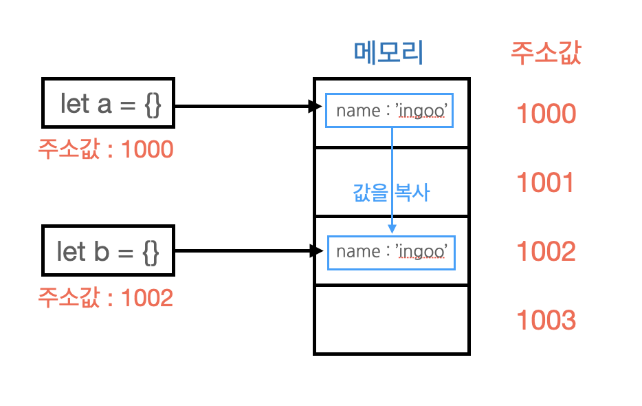 //이 코드가 실행되면서 b의 공간에 a객체에서 {} 안의 데이터만 복사해서 b에 넣음.