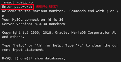 -u아이디 p를 입력한 상태에서 비밀번호만 입력하면 mysql로 접속할 수 있다.