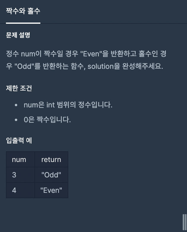 정수 num이 짝수일 경우 "Even"을 반환하고 홀수인 경우 "Odd"를 반환하는 함수, solution을 완성해주세요. 제한 조건 num은 int 범위의 정수입니다. 0은 짝수입니다. 입출력 예 num return 3 "Odd" 4 "Even"