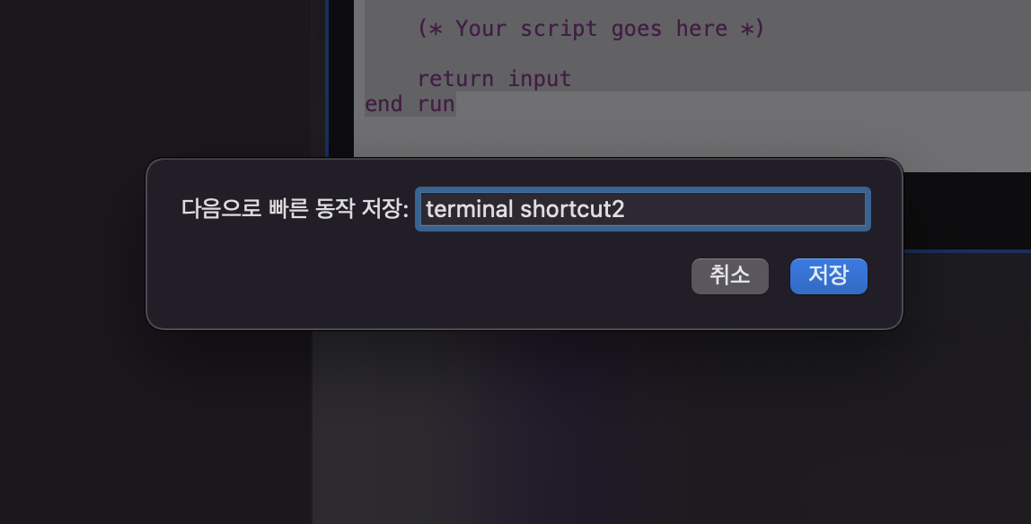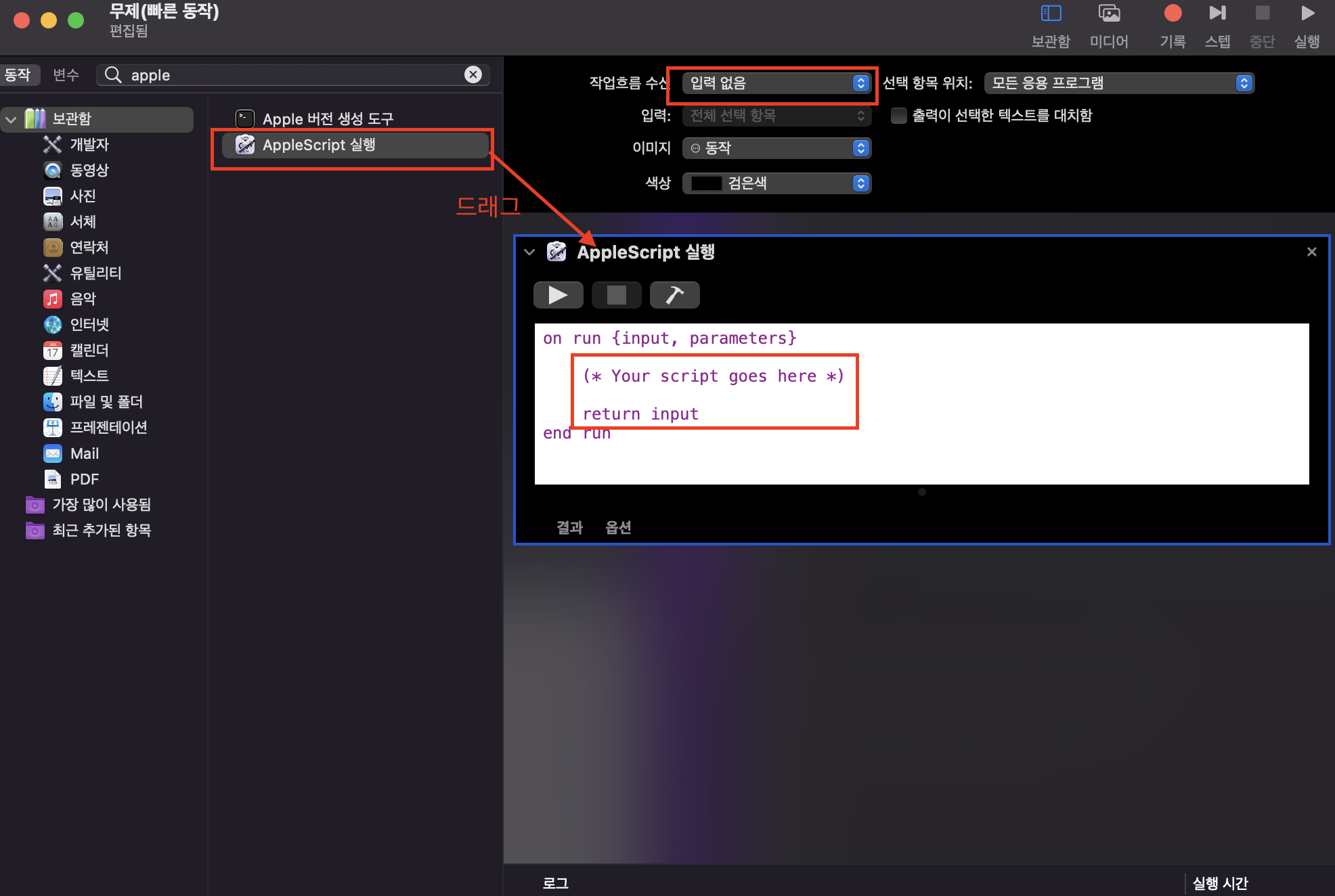 4. AppleScript 실행을 드래그 한 후 다음 코드를 작성
