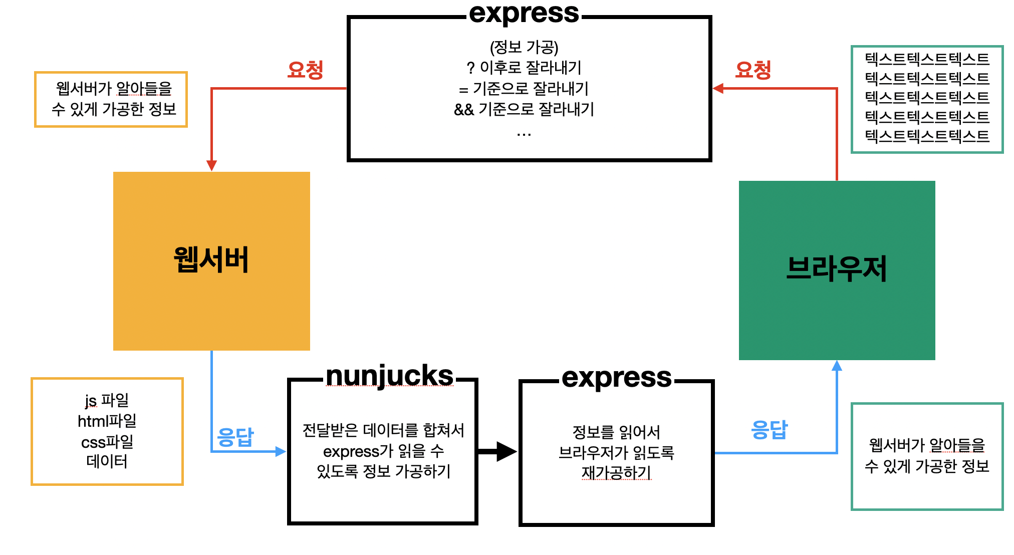 - 템플릿엔진(nunjucks)가 파일을 읽고 텍스트형태로 가공해서 express에게 전달해준다.
