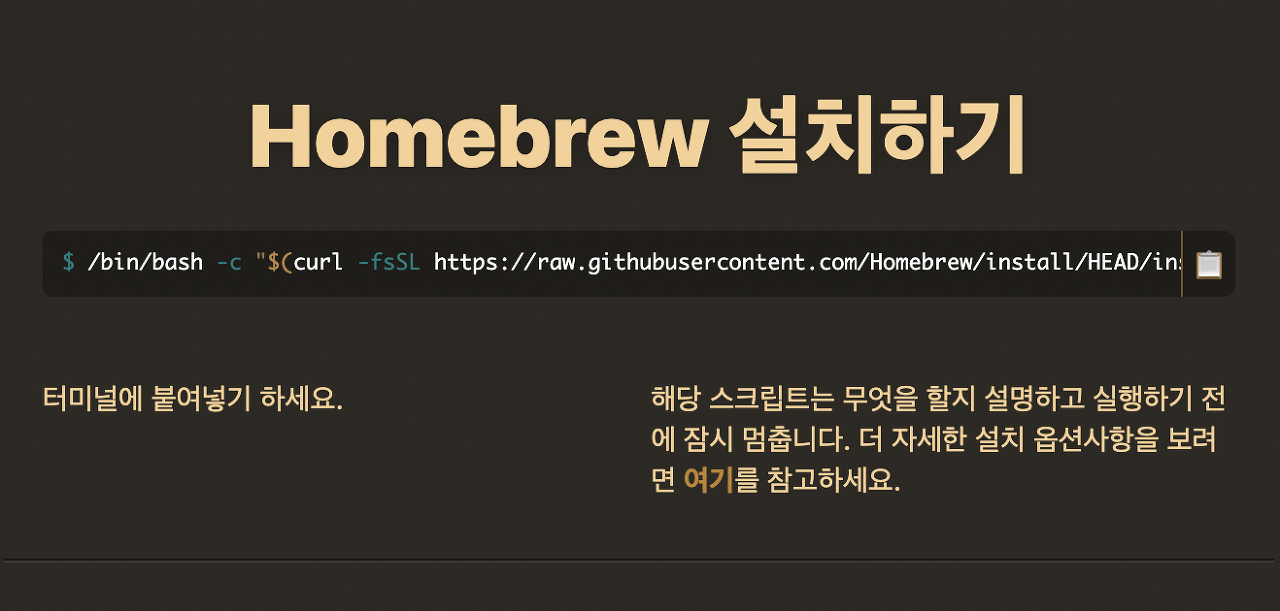 homebrew 사이트에 들어가서 위에 보이는 코드를 터미널에 붙여넣기를 하면된다.