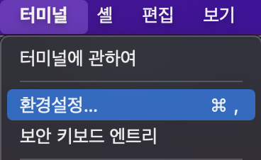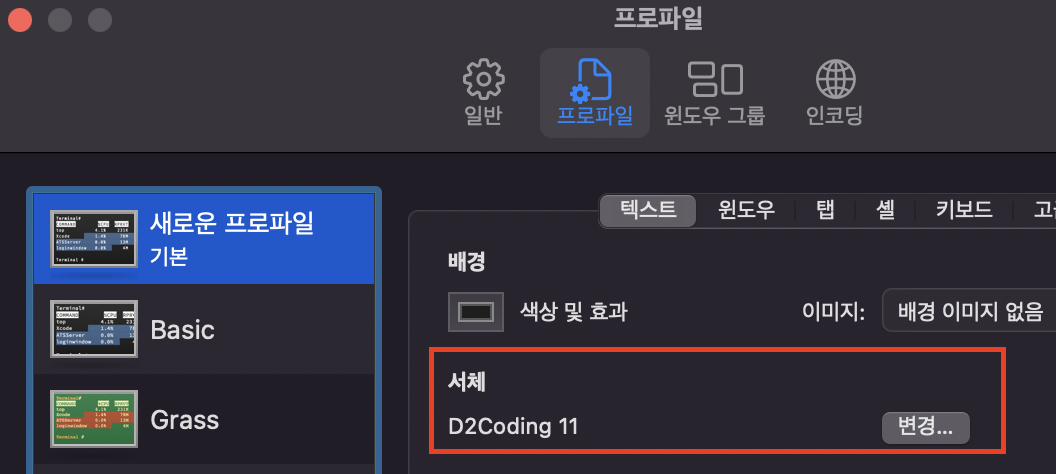터미널 > 환경설정 > 프로파일 > 지금 사용하고있는 프로파일 선택 > 텍스트