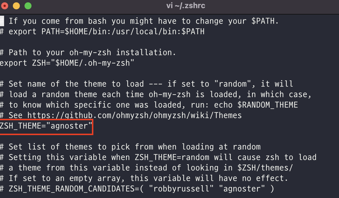 나는 branch를 명확하게 나타내주는 agnoster코드를 사용할거니 i를 눌러 insert 모드로 바꾸고, 저렇게 바꿔주자.