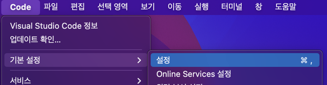 command키와 ,를 동시에 눌러주면 설정이 뜬다.