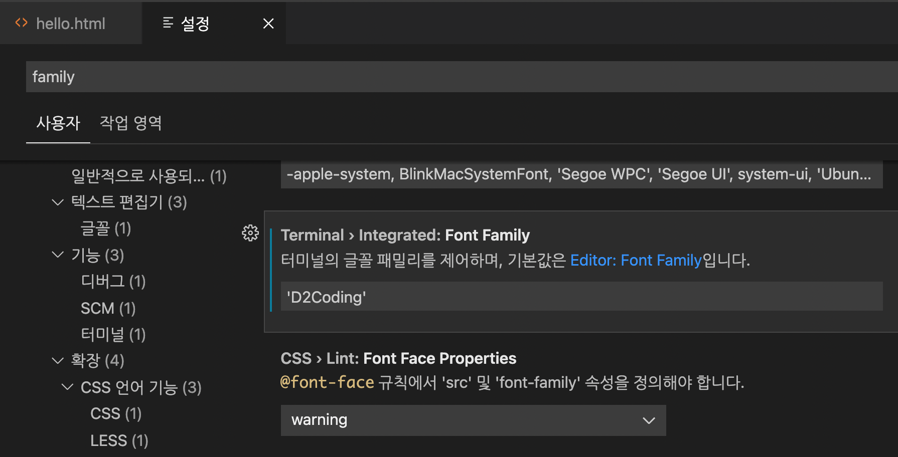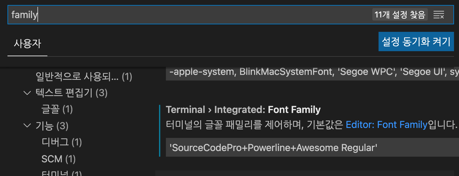설정에 돌아가서 family를 검색해보면 터미널 언어로 잘 자리잡은걸 확인할 수 있다.