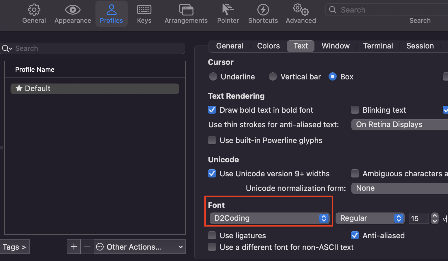 이렇게 설정창이 뜰텐데, Profiles > Text 를 눌러서 Font창에서 아까 설치한 D2Coding 글꼴을 적용해주자